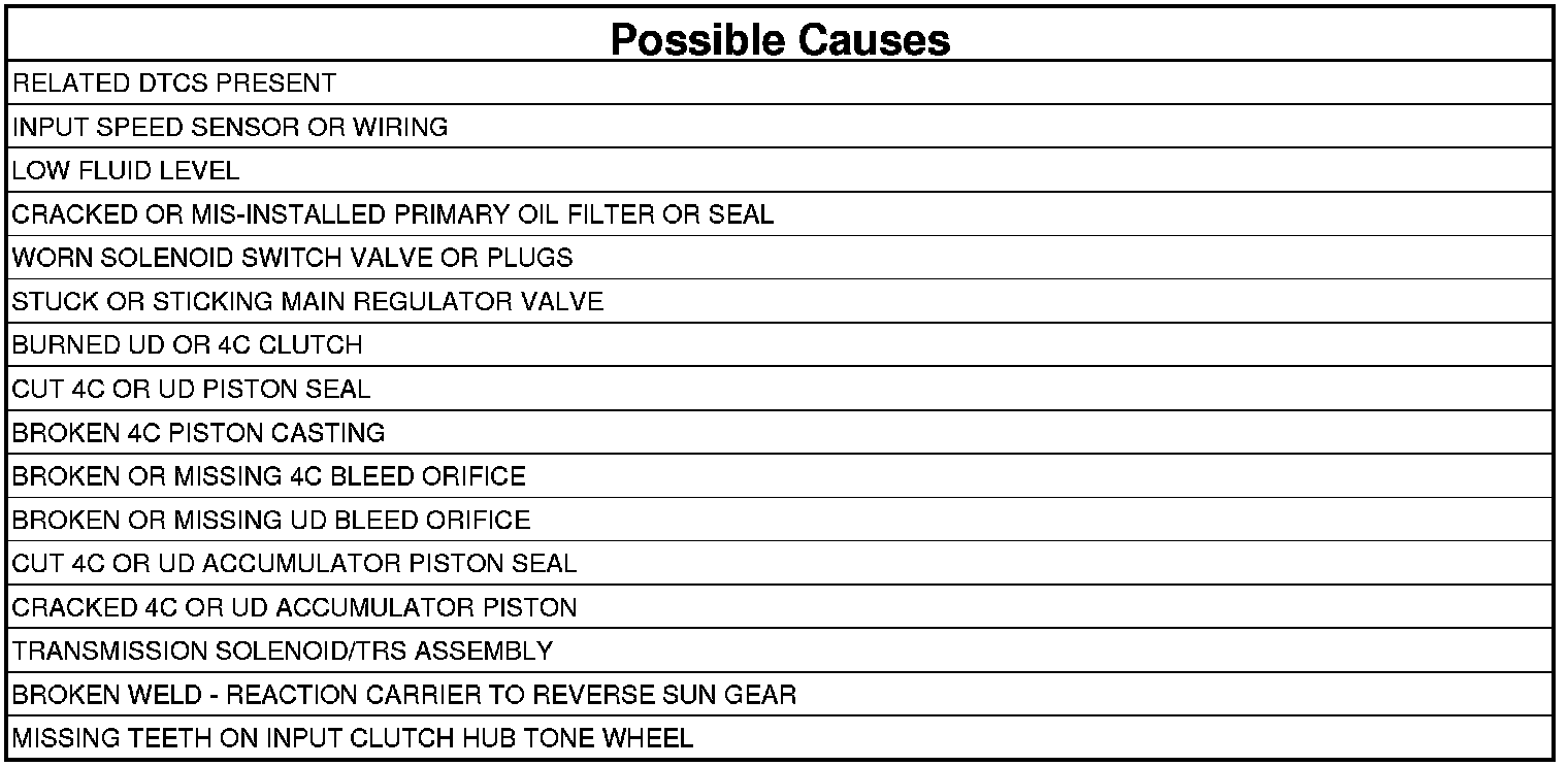 NOTE: Various Gear Ratio Error DTCs will set only if the transmission slips after first achieving the correct ratio. Therefore, a transmission with no drive (or reverse) may not set any Gear Ratio Error DTC because it never achieves a correct gear ratio.