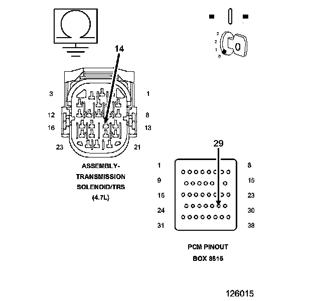 4. Measure the resistance of the (T50) L/R Pressure Switch Sense circuit between the appropriate terminal of the PCM Pinout Box 8815 to the Solenoid/TRS Assembly harness connector.