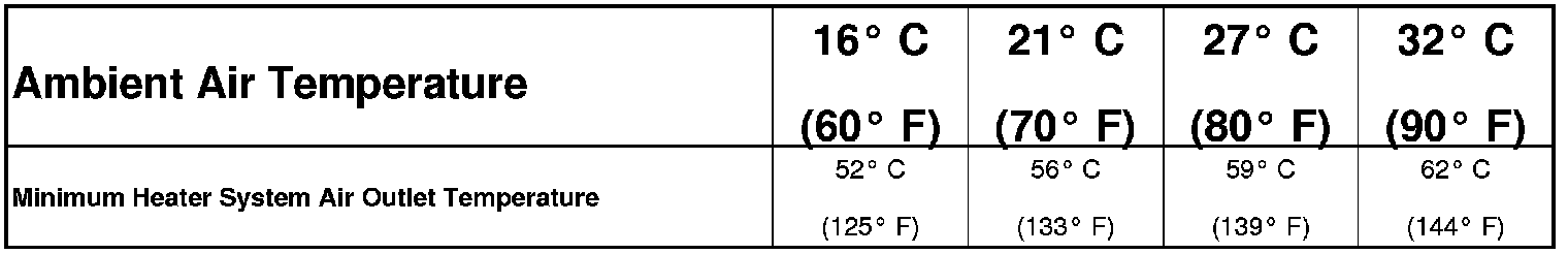 Engine coolant is delivered to the heater core through two heater hoses. With the engine idling at normal operating temperature, set the temperature control to the full hot position, the mode control to the floor position, and the blower motor control to the highest speed position. Using a test thermometer, check the temperature of the air being discharged at the front floor outlets. Compare the test thermometer reading to the Heater Temperature Reference chart.