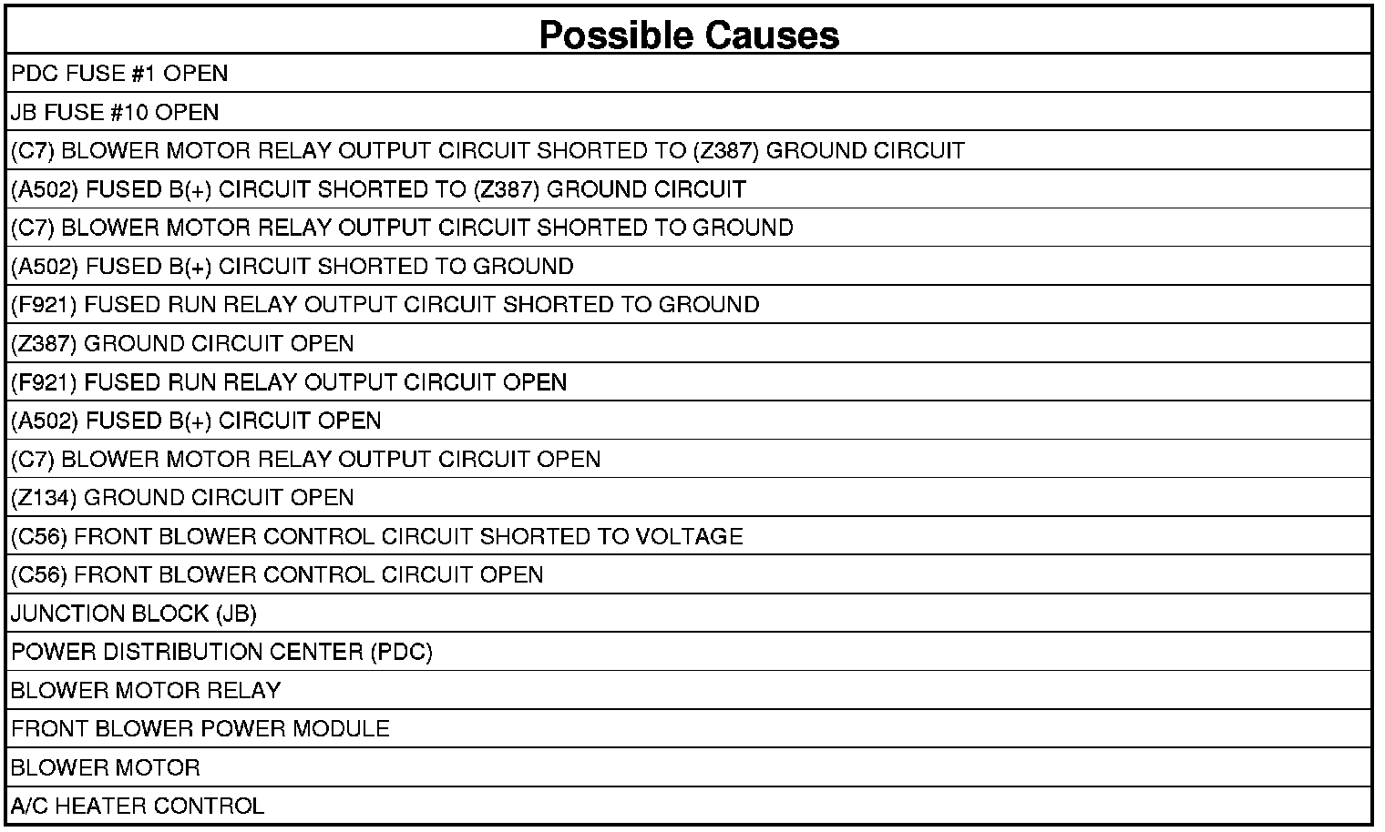 - Repair the (C56) Front Blower Control circuit for a short to voltage.