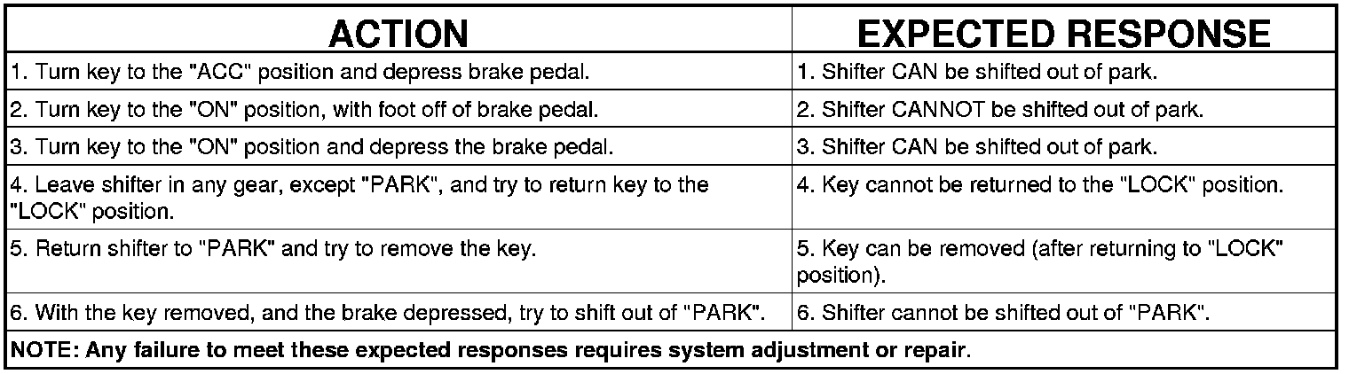 The following chart describes the normal operation of the Brake Transmission Shift Interlock (BTSI) system. If the "expected response" differs from the vehicle's response, then system repair and/or adjustment is necessary.