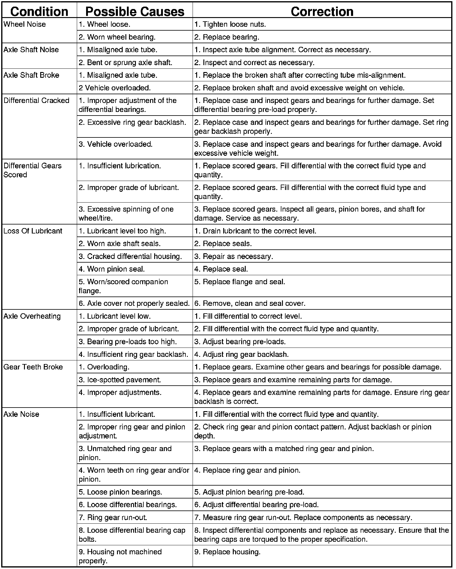 Axle gear noise can be caused by insufficient lubricant, incorrect backlash, incorrect pinion depth, tooth contact, worn/damaged gears, or the carrier housing not having the proper offset and squareness.