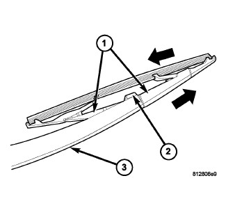 2. To remove the blade from the wiper arm, squeeze the two latch release tabs (2) together while pulling the blade straight out from the receptacle in the end of the arm.
