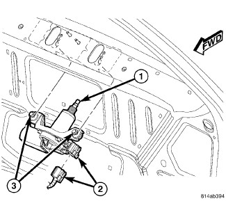 1. Position the rear wiper motor and mounting bracket into the liftgate as a unit with the two mounting screws (3) loosened.