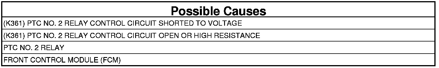 If the Front Control Module (FCM) detects that the (K361) PTC No. 2 Relay Control circuit voltage is shorted to voltage.
