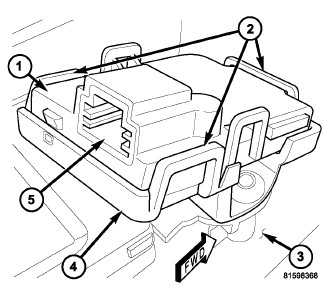 3. Locate the intrusion sensor receiver (1) in the mounting bracket (4) on the right front corner of the overhead console housing (3).