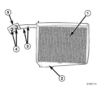 The A/C evaporator (1) for the heating-A/C system is located within the HVAC housing, behind the instrument panel. The A/C evaporator and insulator (2) are positioned in the HVAC housing so that all air entering the housing must pass over the evaporator fins before it is distributed through the heating-A/C system ducts and outlets. However, air passing over the evaporator fins will only be conditioned when the A/C compressor is engaged and circulating refrigerant through the A/C evaporator.