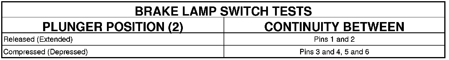 3. Using an ohmmeter, perform the continuity tests at the terminal pins (1) in the brake lamp switch connector receptacle as shown in the Brake Lamp Switch Tests table.