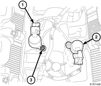5. Remove hold down bolt (3) from MDS solenoid(s) (2).