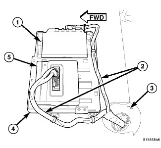 The Park Assist Module (1) is secured on the inboard side of a molded plastic tray-like mounting plate (4) located on the rear floor panel (3) under the left rear seat cushion. The outboard side of this mounting plate also secures the Final Drive Control Module (FDCM) (5) on vehicles that are so equipped. Both modules are connected to the vehicle electrical system through dedicated take outs and connectors of the underbody wire harness (2).