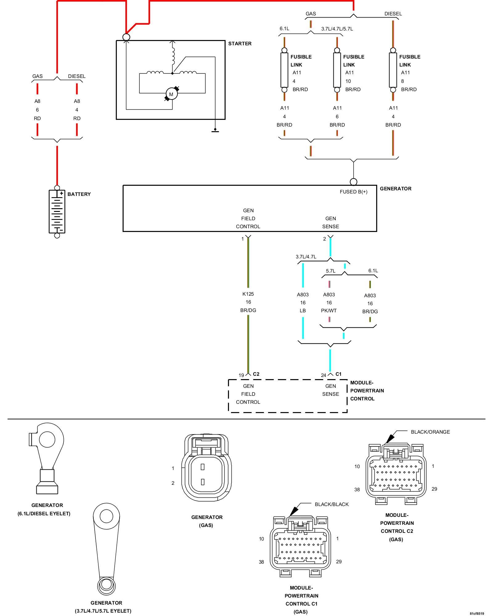 1. Using the wiring diagram/schematic as a guide, inspect the wiring and connectors between the Generator and the Powertrain Control Module (PCM).