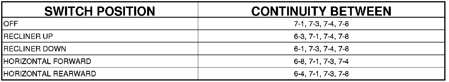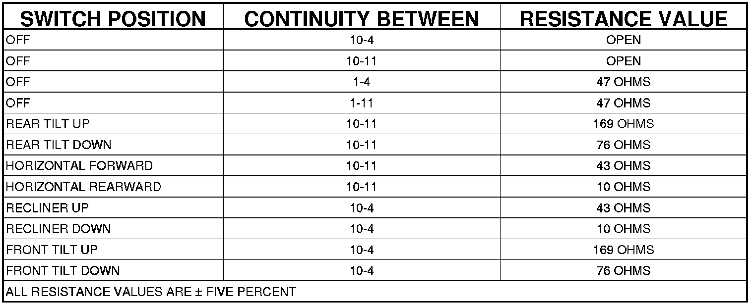 3. Use an ohmmeter to test the continuity of the power seat switch. Refer to DRIVER POWER SEAT SWITCH WITHOUT MEMORY SEAT SYSTEM CONTINUITY table. If not OK, replace the faulty power seat switch. If switch tests OK Component Tests and General Diagnostics.