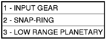 12. Install the snap-ring (2) to hold the input gear (1) into the low range planetary (3).