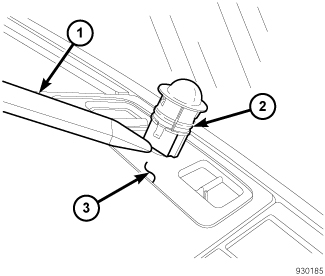 2. Using Trim Stick C-4755 (1) or equivalent, gently pry between both sides of the sun sensor (2) and the instrument panel (3) to release the snap clip retainers located at the front of the sensor near the windshield.