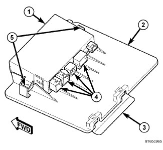 4. Using a trim stick or another suitable wide flat-bladed tool, gently pry the latch features (5) on each side of the mounting plate (2) away from the mounting tabs of the module far enough to disengage the module.