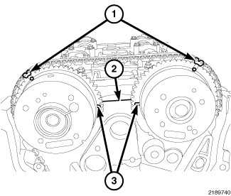 3. Install timing chain so plated (or marked) links on chain align with timing marks on camshaft sprockets (1).