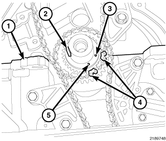 4. Align timing mark on the crankshaft sprocket (3) or (5) with the plated (or marked) link (4) on the timing chain. Position chain so slack will be on the tensioner side.