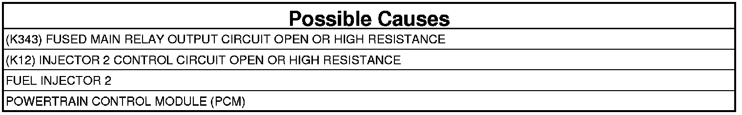 - Repair the (K12) Injector 2 Control circuit for an open circuit or high resistance.