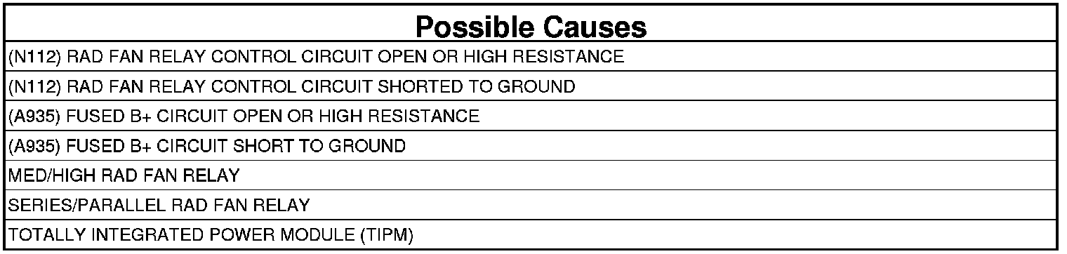 - Repair the short to ground in the (N112) Rad Fan Relay Control circuit.