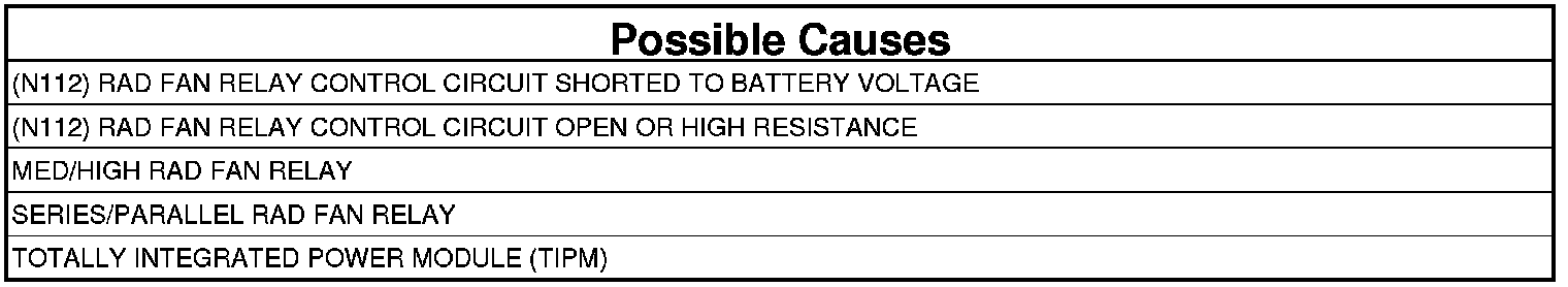 - Repair the short to voltage in the (N112) Rad Fan Relay Control circuit.