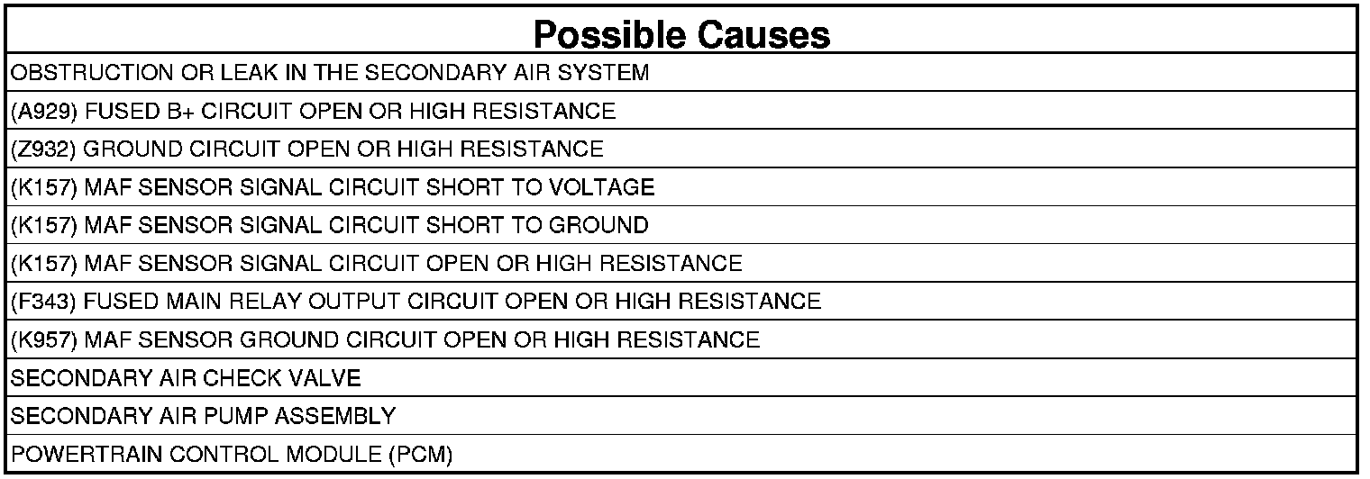 After the diagnostics for Airflow Sensor Rationality (P2431) has passed, while the Secondary Air Pump Relay control is active. Engine Coolant Temperature (ECT) above 0° C (32° F), ambient air temperature within approximately 2 degrees of ECT, and Secondary Airflow diagnostic counter above 100 (approximately 3.0 seconds).
