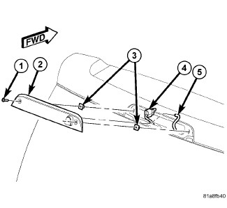 1. Check to be certain that the two plastic nuts (3) are properly installed and in good condition on each side of the Center High Mounted Stop Lamp (CHMSL) (2) opening in the upper header of the liftgate outer panel.