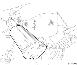 3. Depress locking tab on vapor hose connector and pull off of canister.