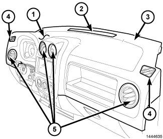 There are four instrument panel air outlets (5). One air outlet is located near each outboard end of the instrument panel facing the rear of the vehicle and two air outlets are located at the top of the instrument panel center bezel. Each of the instrument panel air outlets contain a movable diffuser that can direct or shut off the flow of the conditioned air leaving the instrument panel outlets. All instrument panel air outlets can be serviced separately.