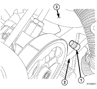 The high side service port (1) is located on the A/C discharge line (2) in front of the engine, below the upper radiator hose (3).