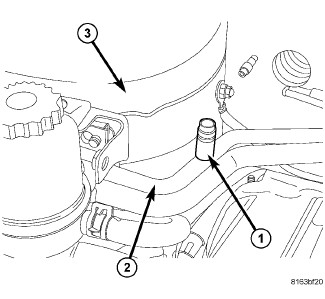 The low side service port (1) is located on the A/C liquid line (2) near the right front strut tower (3). Both the high side and low side A/C service port valve cores are serviceable.