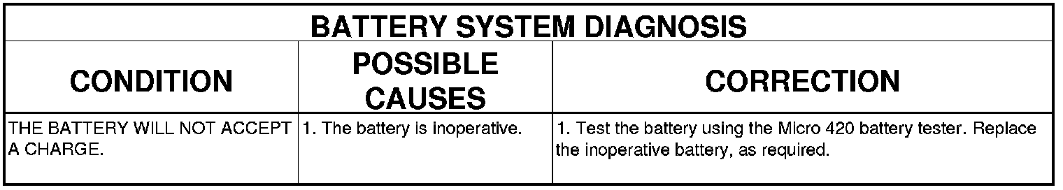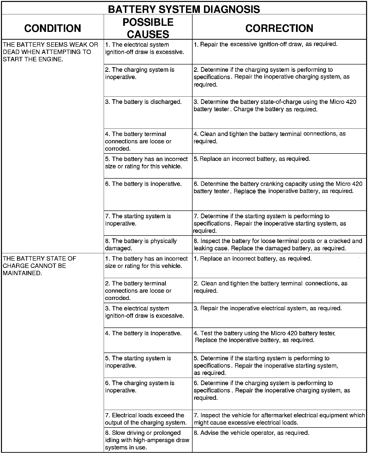 The battery, starting, and charging systems in the vehicle operate with one another and must be tested as a complete system. In order for the engine to start and the battery to maintain its charge properly, all of the components that are used in these systems must perform within specifications. It is important that the battery, starting, and charging systems be thoroughly tested and inspected any time a battery needs to be charged or replaced. The cause of abnormal battery discharge, overcharging or early battery failure must be diagnosed and corrected before a battery is replaced and before a vehicle is returned to service. The service information for these systems has been separated within this service manual to make it easier to locate the specific information you are seeking. However, when attempting to diagnose any of these systems, it is important that you keep their interdependency in mind.