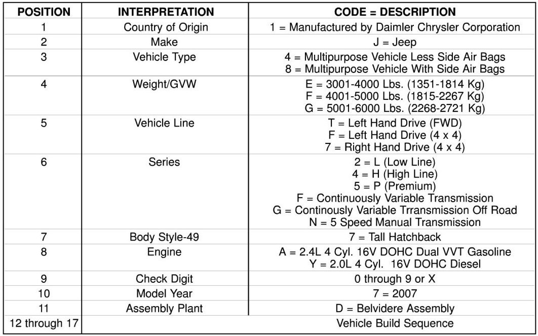 VEHICLE IDENTIFICATION NUMBER DECODING CHART