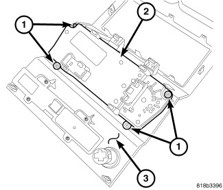 1. Install the A/C-heater control (2) onto the back of the instrument panel center bezel (3).