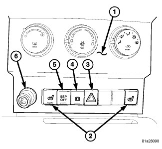 The inverter module is located under the right rear seat cushion. The A/C outlet is mounted in the rear of the center floor console. The inverter module provides A/C power for user accessories when the 115 Volt AC outlet switch (4) in the instrument panel center stack (1) is in the "ON" position. The inverter converts the 12 Volt DC from the vehicle battery system to a 115 Volt AC output. The outlet switch is part of the accessory switch bank assembly and is not available for service as an individual part. If the switch is damaged or inoperative the complete accessory switch bank assembly must be replaced, Heated Seat Switch - Removal for the appropriate procedure.