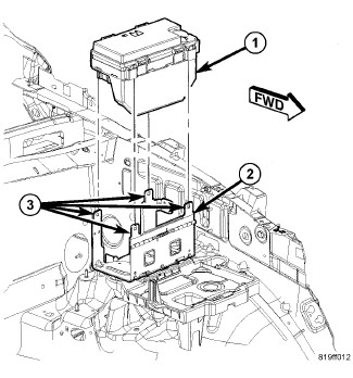 5. Using an appropriate flat bladed tool, depress the four mounting clips to disengage and remove the TIPM housing (1) from the TIPM bracket mounting tabs (3).