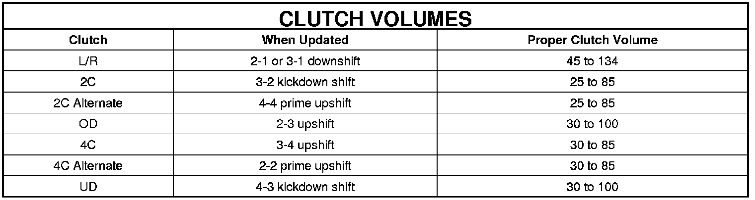 Certain mechanical problems within the input clutch assembly (broken return springs, out of position snap rings, excessive clutch pack clearance, improper assembly, etc.) can cause inadequate or out-of-range element volumes. Also, defective Input/Output Speed Sensors and wiring can cause these conditions. The following chart identifies the appropriate clutch volumes and when they are monitored/updated: