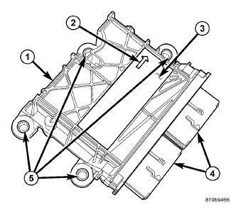 An arrow (2) printed on the label (3) on the top of the ORC housing provides a visual verification of the proper orientation of the unit, and should always be pointed toward the front of the vehicle. The ORC housing has four integral mounting flanges (5) with metal sleeves to provide crush protection. Two molded plastic electrical connector receptacles (4) are integral to the end cover plate. These receptacles connect the ORC to the vehicle electrical system through dedicated take outs and connectors from the instrument panel and the body wire harnesses.