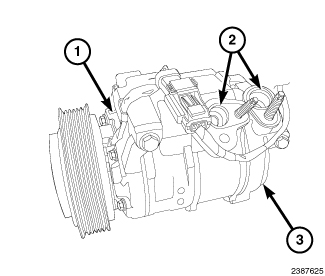 2.2L Diesel models are equipped with a clutch operated Denso 10SRE18 A/C compressor (1) with a fixed displacement of 180 cubic centimeters (11 cubic inches). This A/C compressor is a reciprocating, swash plate-type compressor with five double-acting pistons. The A/C compressor has the suction and discharge ports (2) and the high pressure relief valve (3) located near the rear of the compressor.