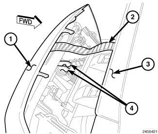 NOTE: Before attempting to reset, and after each unsuccessful attempt to reset an AHR, inspect the latch mechanism within the AHR rear trim cover (1) to be certain the latch is unlatched. This can be confirmed by placing a finger on the latch catches (4) and gently rocking them rearward and forward. The catches should move freely. If the catches do not move freely, they are in the latched position and the latch must be opened using the diagnostic scan tool. Follow the steps outlined for AHR - Activate Driver and Passenger under Miscellaneous Functions for the ORC/Occupant Restraint Controller menu item. Each time this routine is performed, both the driver and passenger side AHR unit latches are opened and both AHR units will have to be reset.