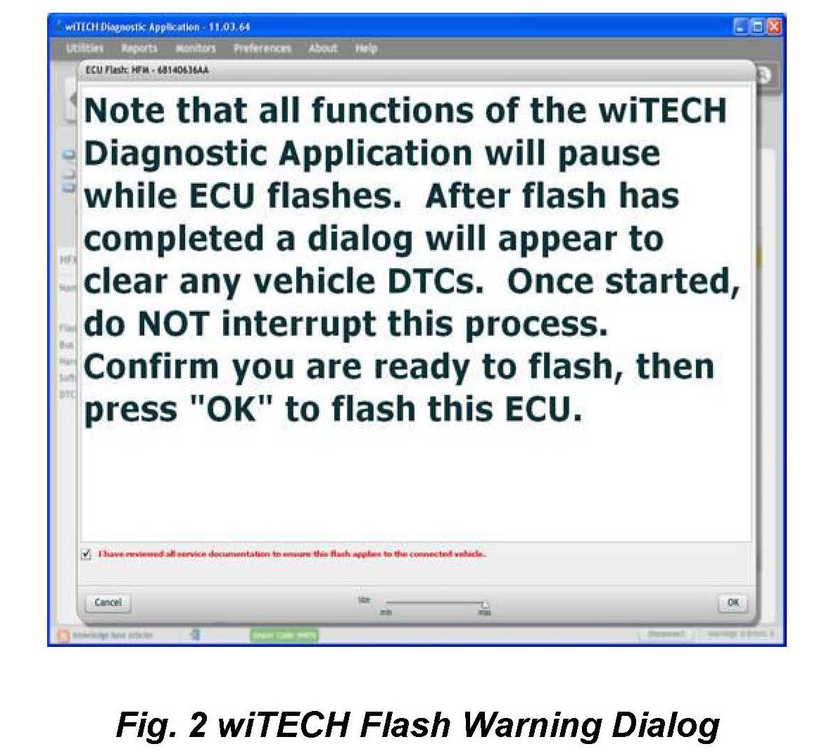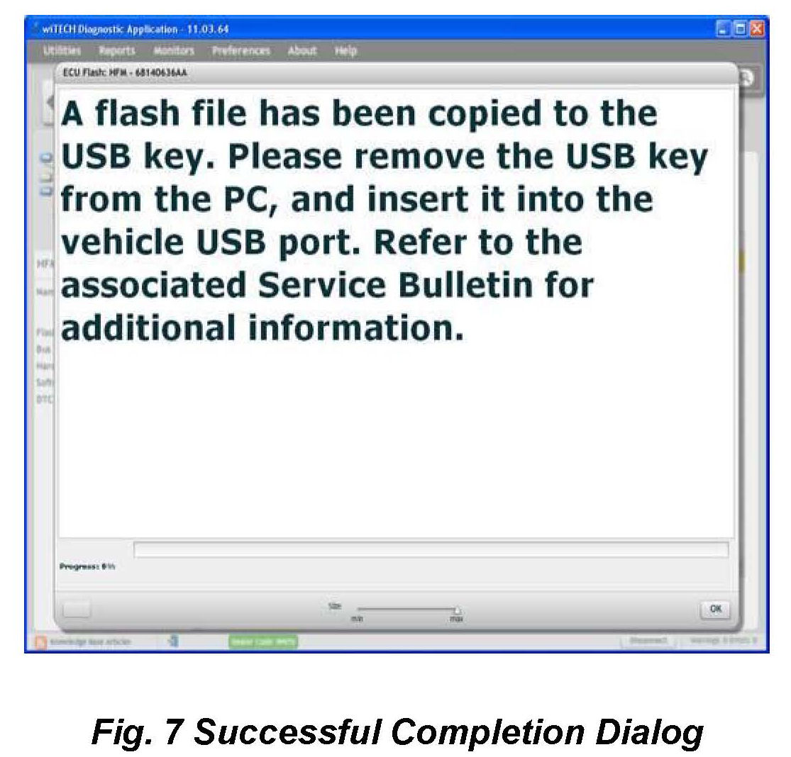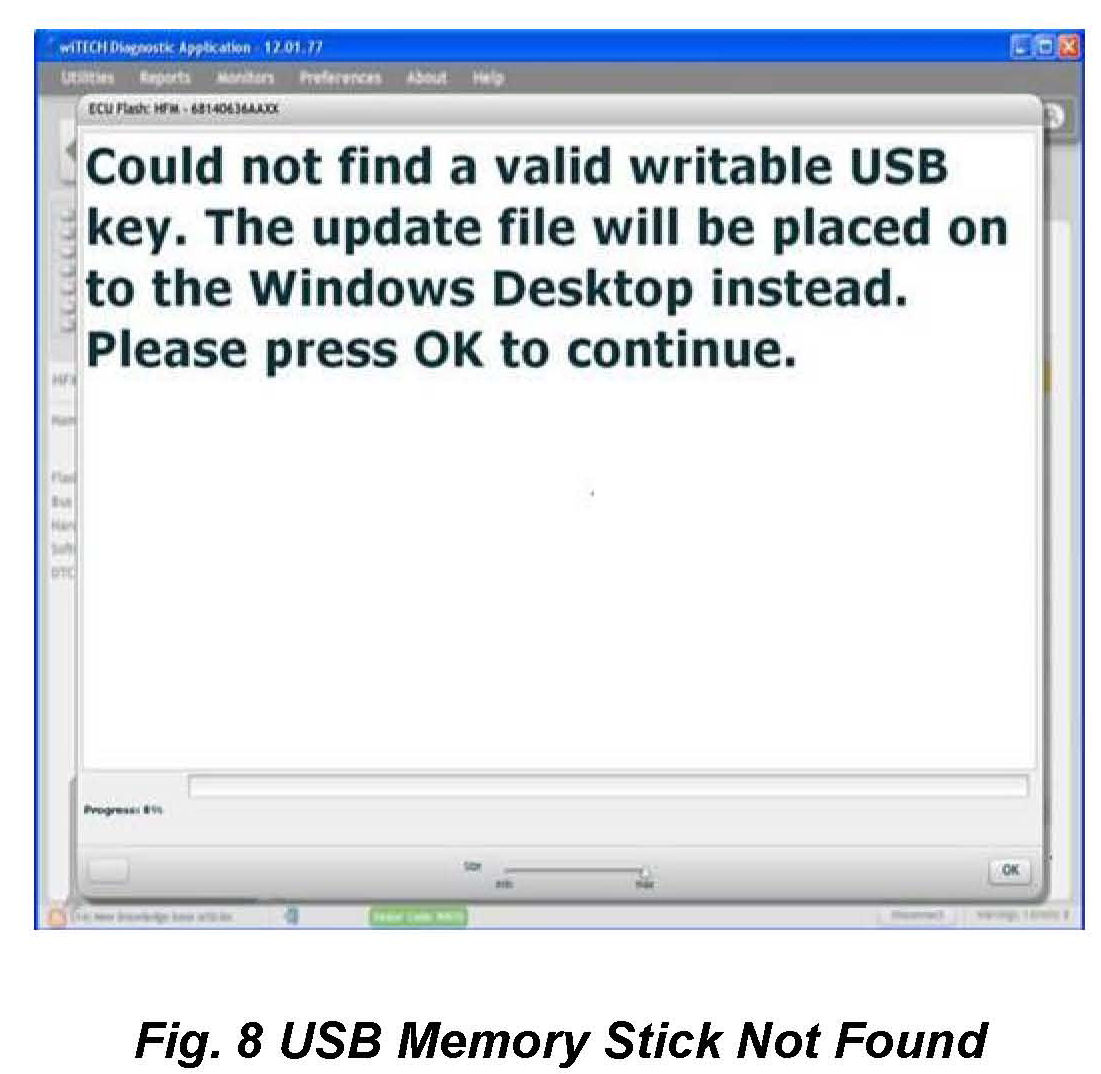 6. A scrollable Process Description Dialog will appear (Fig 5) and (Fig 6). Insert the dealer supplied USB memory stick into the first USB port of the wiTECH computer at this time, ensure that no other USB memory sticks are installed, and click on OK to acknowledge the instructions.