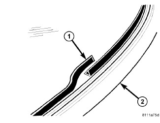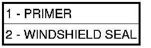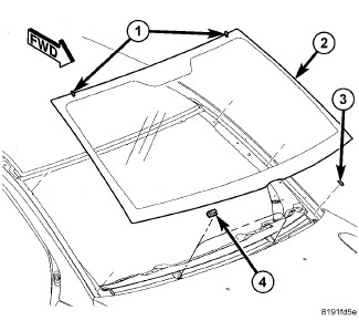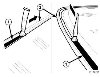 1. Apply bead of adhesive (1) with a triangular nozzle directly to the windshield seal starting at bottom in center of windshield.