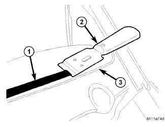 6. Adjust the lower spacers (3) as required, to obtain the specified roof gap tolerance by pushing on the side of the wedge and raising or lowering the glass as necessary. For roof gap specifications, refer to the table Roof Gap Tolerances.
