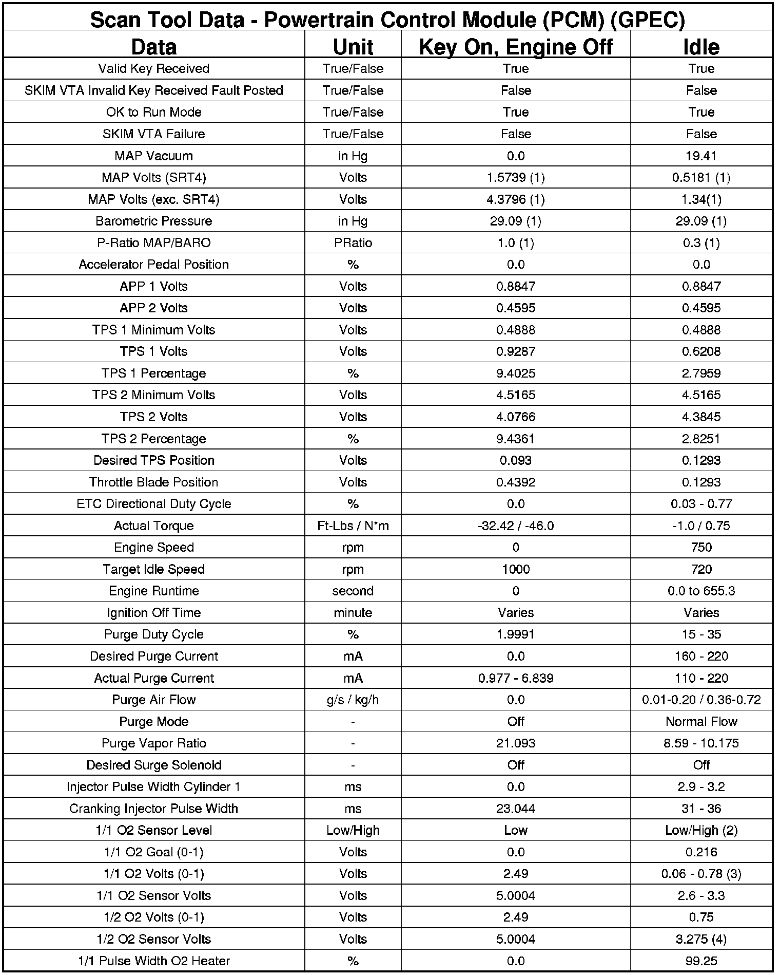 The following chart lists data values taken from the Scan Tool Powertrain Control Module (PCM) data list for the GPEC controller. The values were taken at key on, engine off and at idle. The data is to be used for reference only.