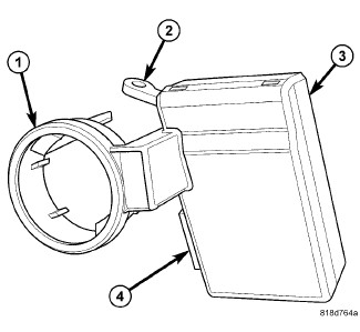 The Sentry Key REmote Entry Module (SKREEM) (3) (also known as the Sentry Key Immobilizer Module/SKIM or the Wireless Control Module/WCM) is the primary component of the Sentry Key Immobilizer System (SKIS). It is also the receiver for the Remote Keyless Entry (RKE) system and the Tire Pressure Monitor (TPM) system. The SKREEM is located on the right side of the steering column near the ignition lock cylinder housing and is concealed beneath the column shrouds. The molded black plastic housing for the SKREEM has an integral molded plastic halo-like antenna ring (1) that extends from one side. When the SKREEM is properly installed, the antenna ring is oriented around the circumference of the ignition lock cylinder housing.