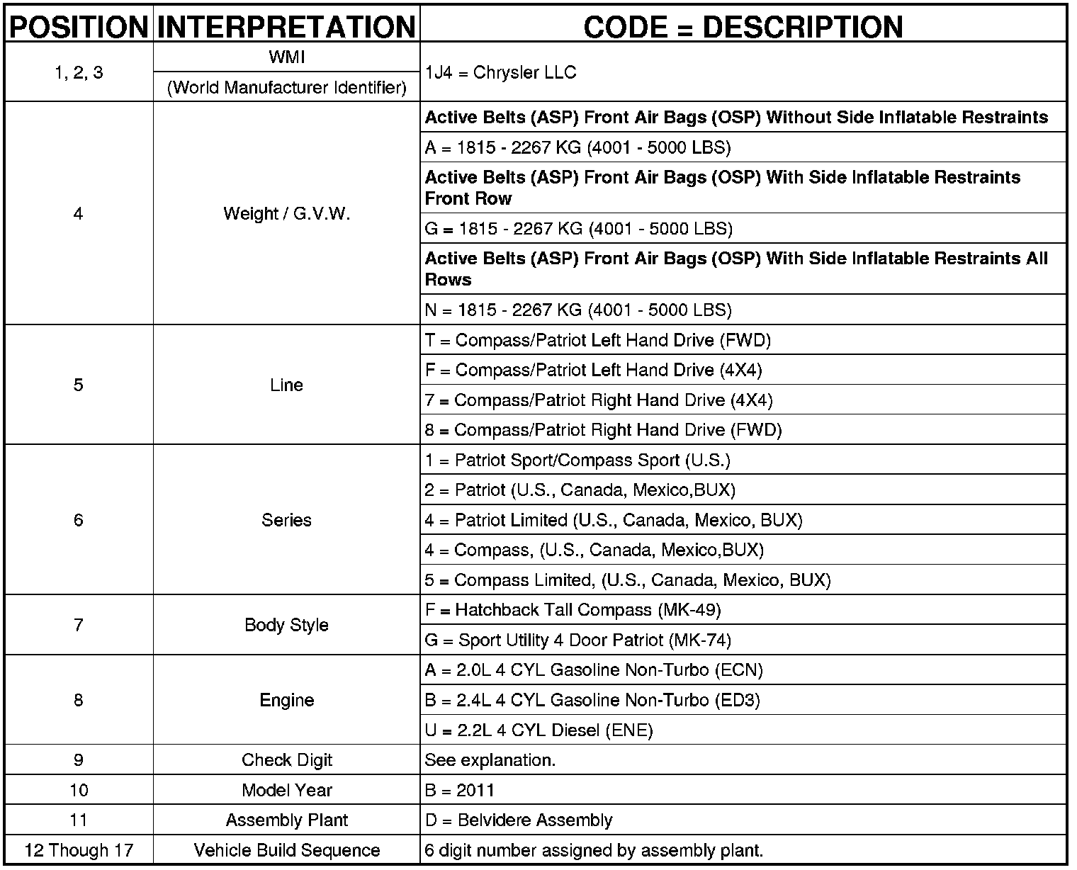 VEHICLE IDENTIFICATION NUMBER DECODING CHART