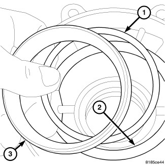 6. Install the shim (3) under the bearing cup (1) in the case side.