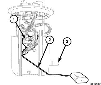 The fuel gauge sending unit (1) is attached to the side of the fuel pump module. The fuel gauge sending unit consists of a float arm (2) and a variable resistor track (card).