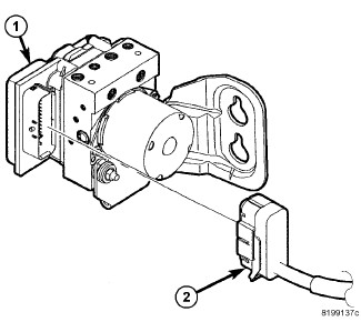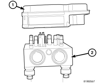 3. Remove four screws (1) attaching antilock brake module (ABM) (2) to hydraulic control unit (HCU).