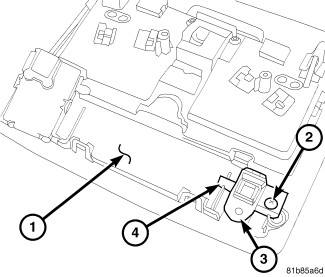1. Position the infrared sensor (3) onto the back of the overhead console (1). Align the tab (4) on the sensor with the slot in the console.