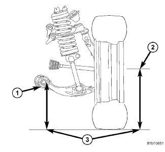 4. Front - On each side of the vehicle, measure the distance from the center of the front lower control arm bushing bolt (1) to the ground (3) Record the measurement. Next measure the distance from the spindle center (2) to the ground (3) Record the measurement.